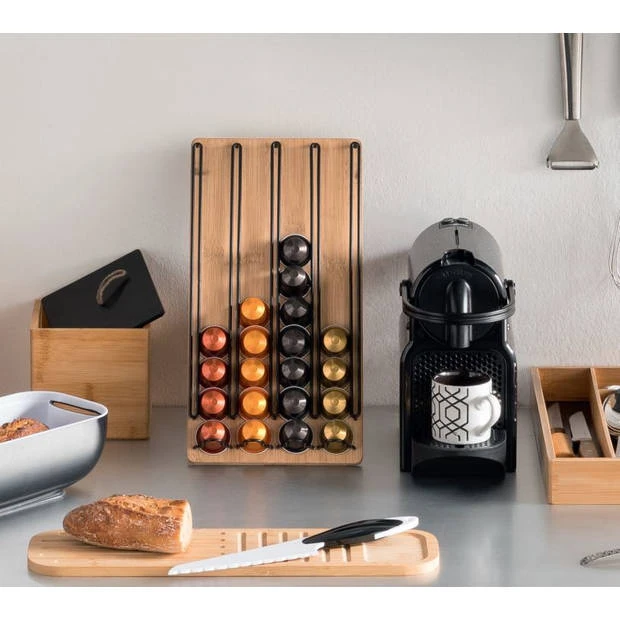 Met deze bamboe capsule houder voor Nespresso cups (of soortgelijke capsules) heb je wat moois op het aanrecht staan. De houder heeft een standaard aan de achterkant om hem rechtop te zetten, maar hij kan ook liggend in de lade gebruikt worden. De capaciteit is 40 capsules, dus hierdoor kun je ook meerdere smaken naast elkaar aanbieden.