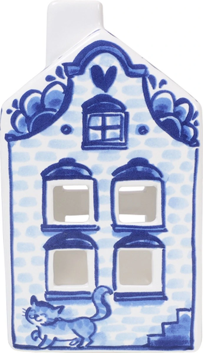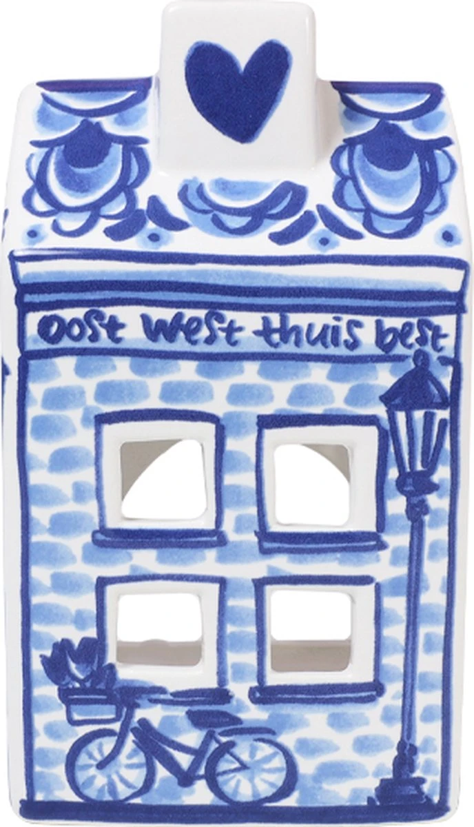 Met onder andere dit schattige theelicht huisje. Er komt sfeervol licht door de raampjes van het huisje. Versier je huis met dit theelicht huisje waar allerlei Hollandse Blond illustraties op staan en de spreuk Oost West Thuis Best!”