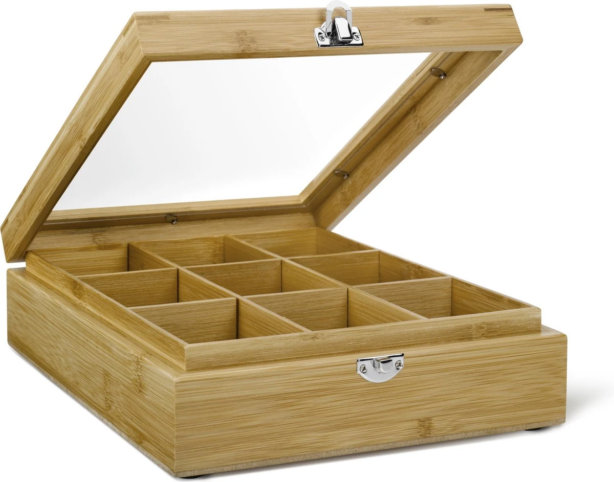 Presenteer verschillende theesmaken in deze stijlvolle 9-vaks theedoos uit de Universal collectie van Bredemeijer. De theedoos is gemaakt van mooi en duurzaam bamboe. Dit materiaal geeft het geheel een chic uiterlijk. De theedoos is voorzien van een deksel met venster.