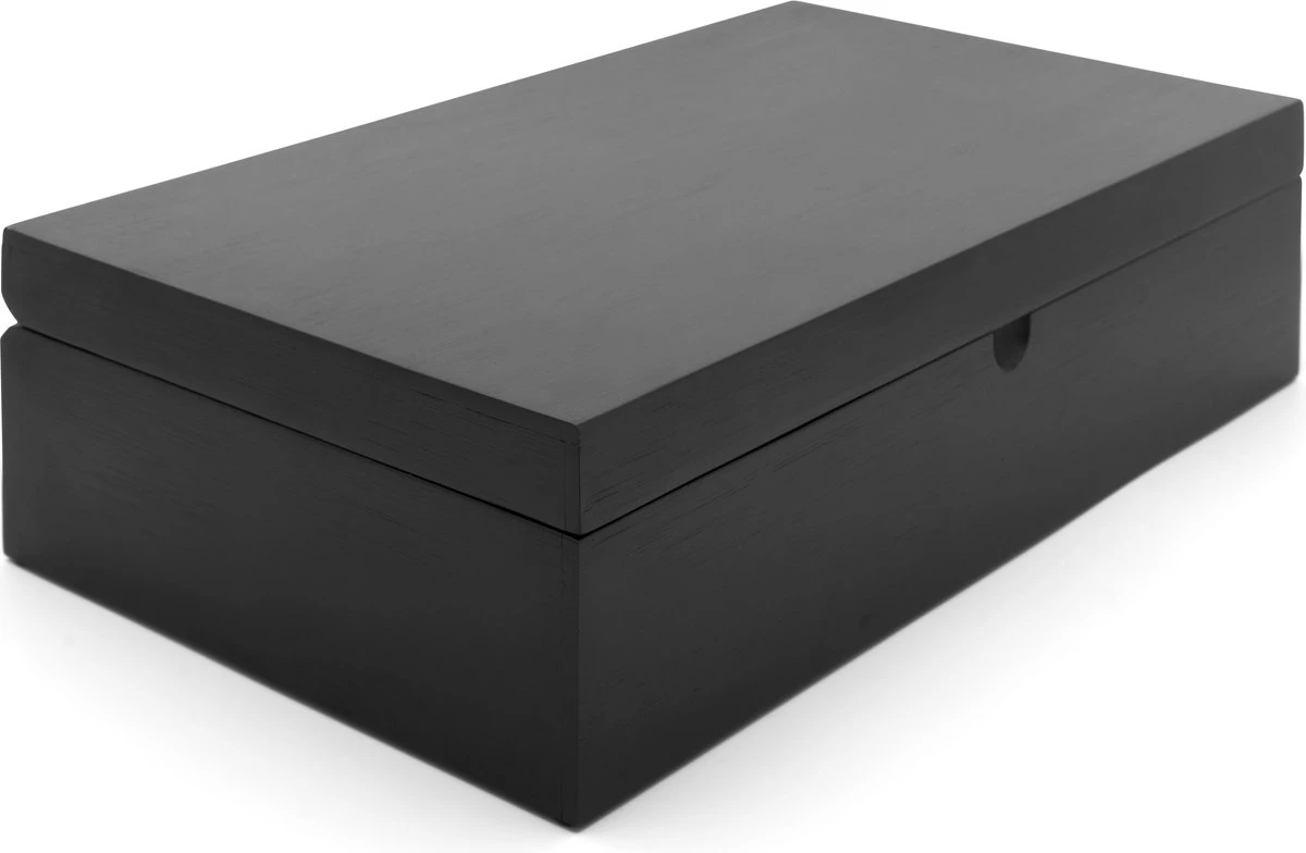 Met de bijhorende theelepel schep je de thee makkelijk uit de blikjes en dankzij de doorzichtige vensters, zie je precies welke thee in welk doosje zit. Door het uitgeslepen gootje aan de voorzijde, is de deksel makkelijk te openenen. De theedoos is gemaakt van bamboe en heeft een stijlvol uitstraling door de matte zwarte kleur. Een musthave voor de echte theeliefhebber!