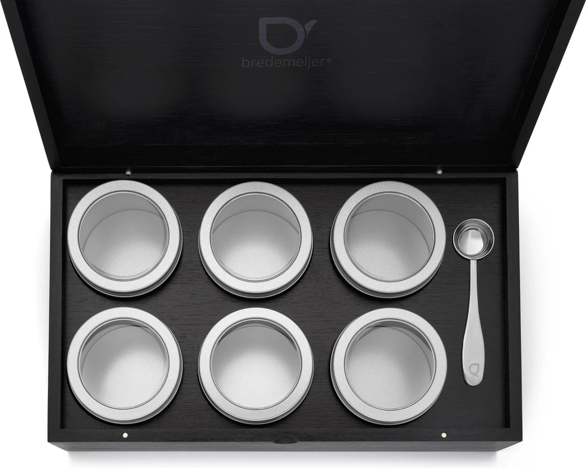 Bewaar je losse thee op stijlvolle wijze met deze zwarte Bredemeijer® theedoos. De theedoos is voorzien van 6 ronde blikjes en speciaal ontwikkeld voor het bewaren van losse thee. Zo blijft de thee langer houdbaar en blijft de smaak behouden.